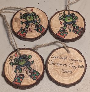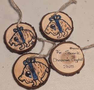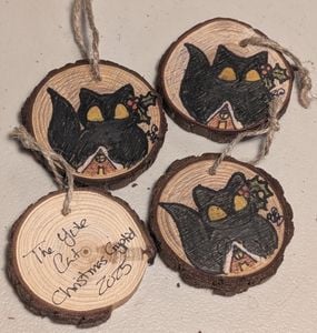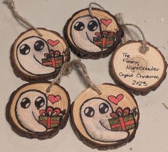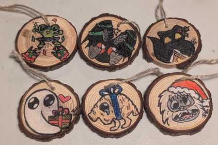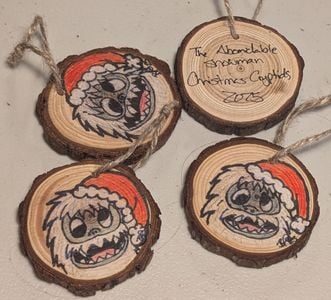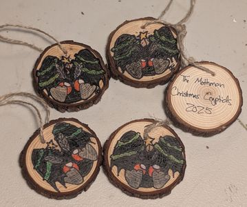 Hand drawn wooden ornaments featuring different cryptids in Christmas themes. Have fun trying to find them after the season!